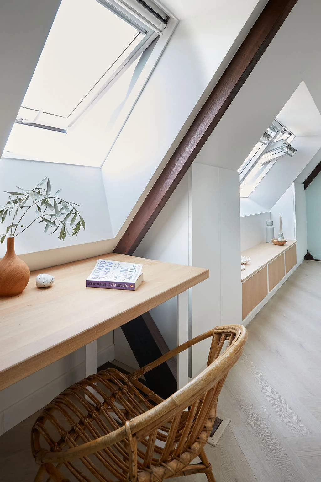 A l'étage, la mezzanine a été entièrement rénovée et permet à présent d'obtenir un volume flexible avec un bureau, un couchage d'appoint, un espace de jeux pour les enfants et une salle d'eau attenante. La mezzanine a été repensée modifiant le reste de la maison.