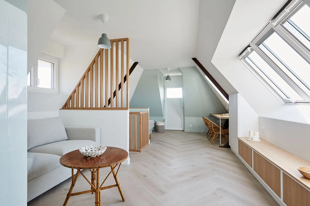 Les éléments anciens ont été modernisés tout en conservant des touches chaleureuses comme le bois clair et les teintes douces, évoquant la tranquillité de la côte bretonne.