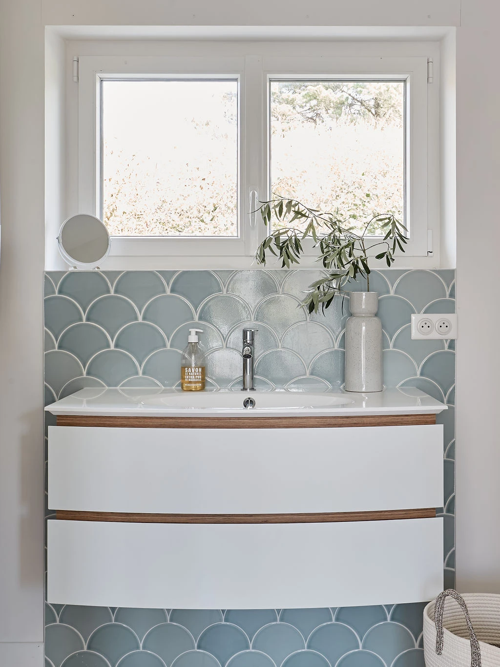 La salle de bain attenante a été entièrement refaite avec des matériaux naturels et des couleurs apaisantes. Une vasque moderne et un carrelage en forme d'écailles évoquent la proximité de l'océan.