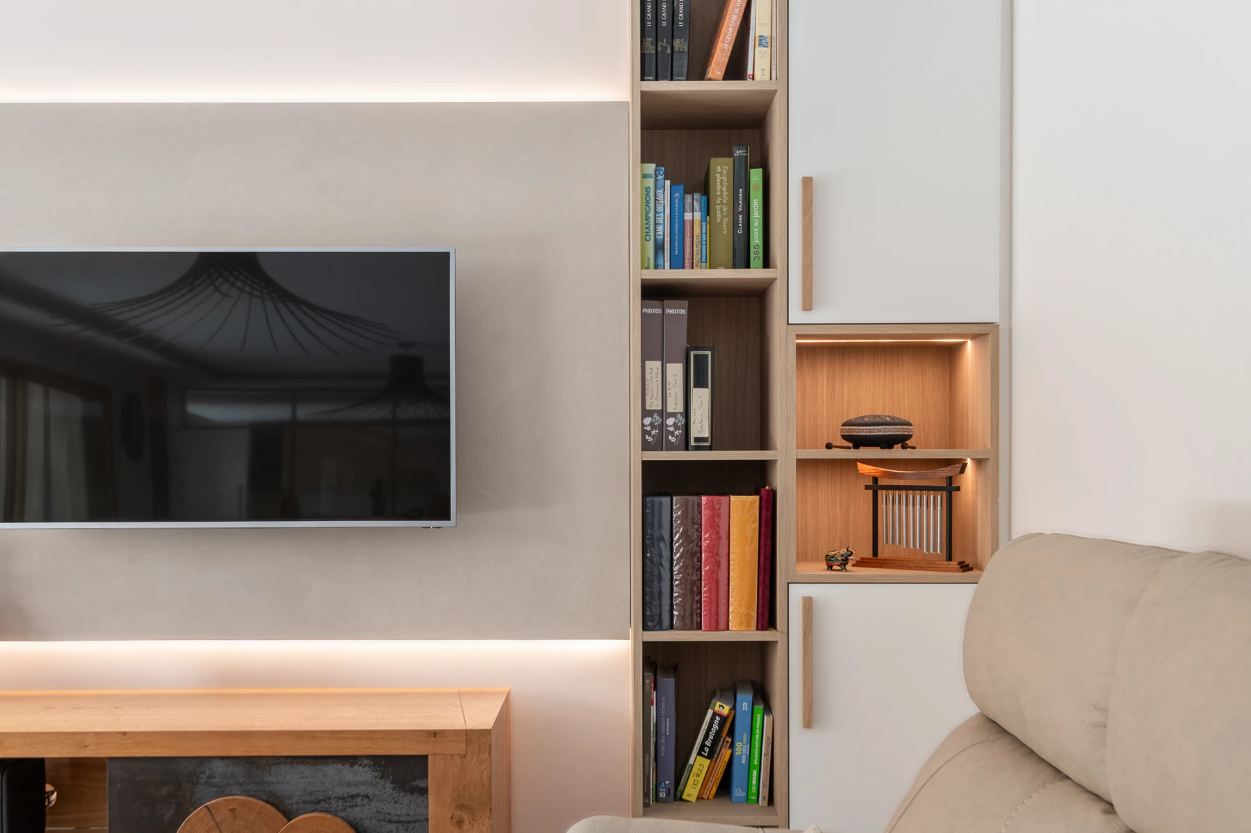 Le sol carrelé a été remplacé par un carrelage imitation parquet, chaleureux et doux. Des faux plafonds à éclairage indirect dessinent subtilement les volumes à la fois dans la cuisine et dans la pièce de vie.