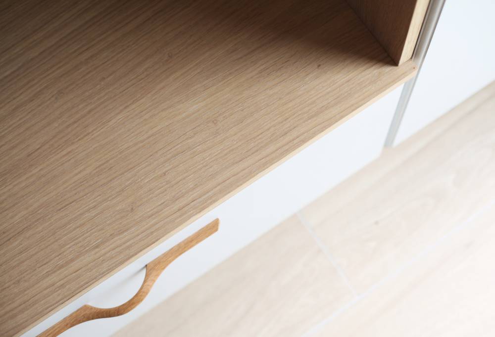 Un carrelage imitation parquet a été posé dans les pièces de vie. Les claustras en chêne massif délimitent les différents espaces, une huile de finition a été appliqué afin d'obtenir la teinte souhaitée.